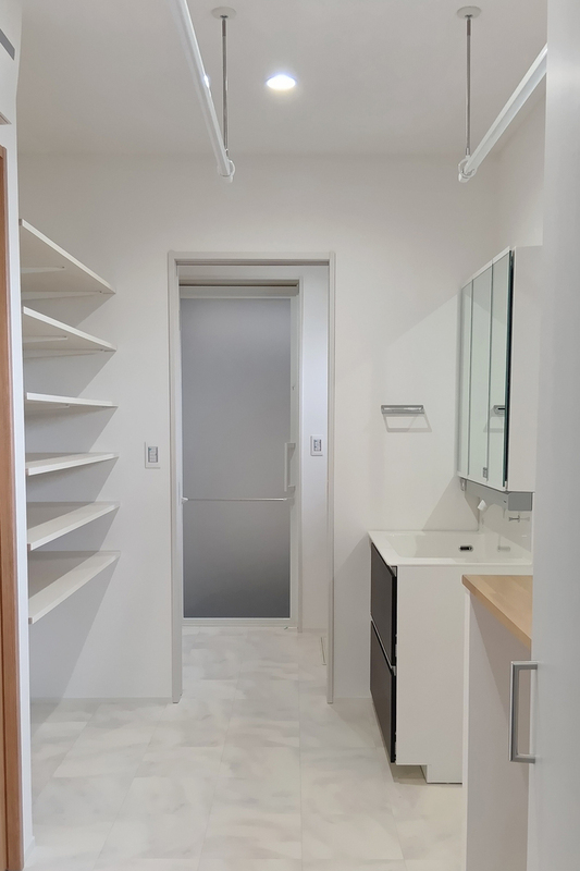 完成したばかりの2邸をご紹介!デザインと暮らしやすさにこだわった平屋 キッチンから洗面室兼ランドリールームへ行け、