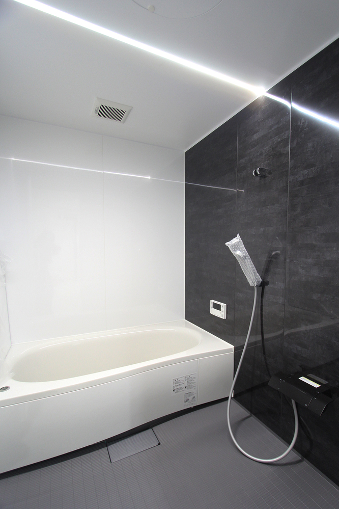 浴室はパナソニック「オフローラ」。窓なし・鏡なし仕様で掃除がラクに。ブラック基調のスタイリッシュなデザインを選びました。